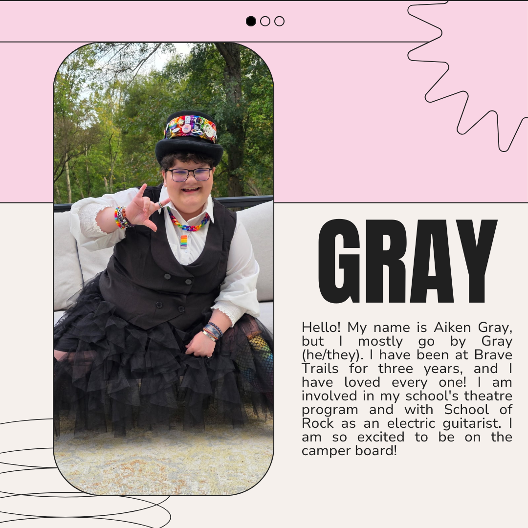 The Camper Board is a youth-led advisory group made up of passionate young leaders who help shape the future of Brave Trails programming. Throughout the year, board members will collaborate with our leadership team to share feedback, spark new ideas, and ensure our programs continue to reflect the needs, interests, and brilliance of LGBTQ+ youth.